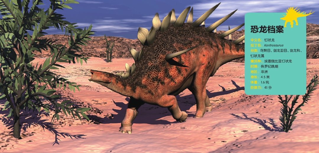 钉状龙是剑龙的近亲,但它后背到尾巴的不是骨板,而是尖刺。它的肩膀和臀部两侧可能也长有尖刺。