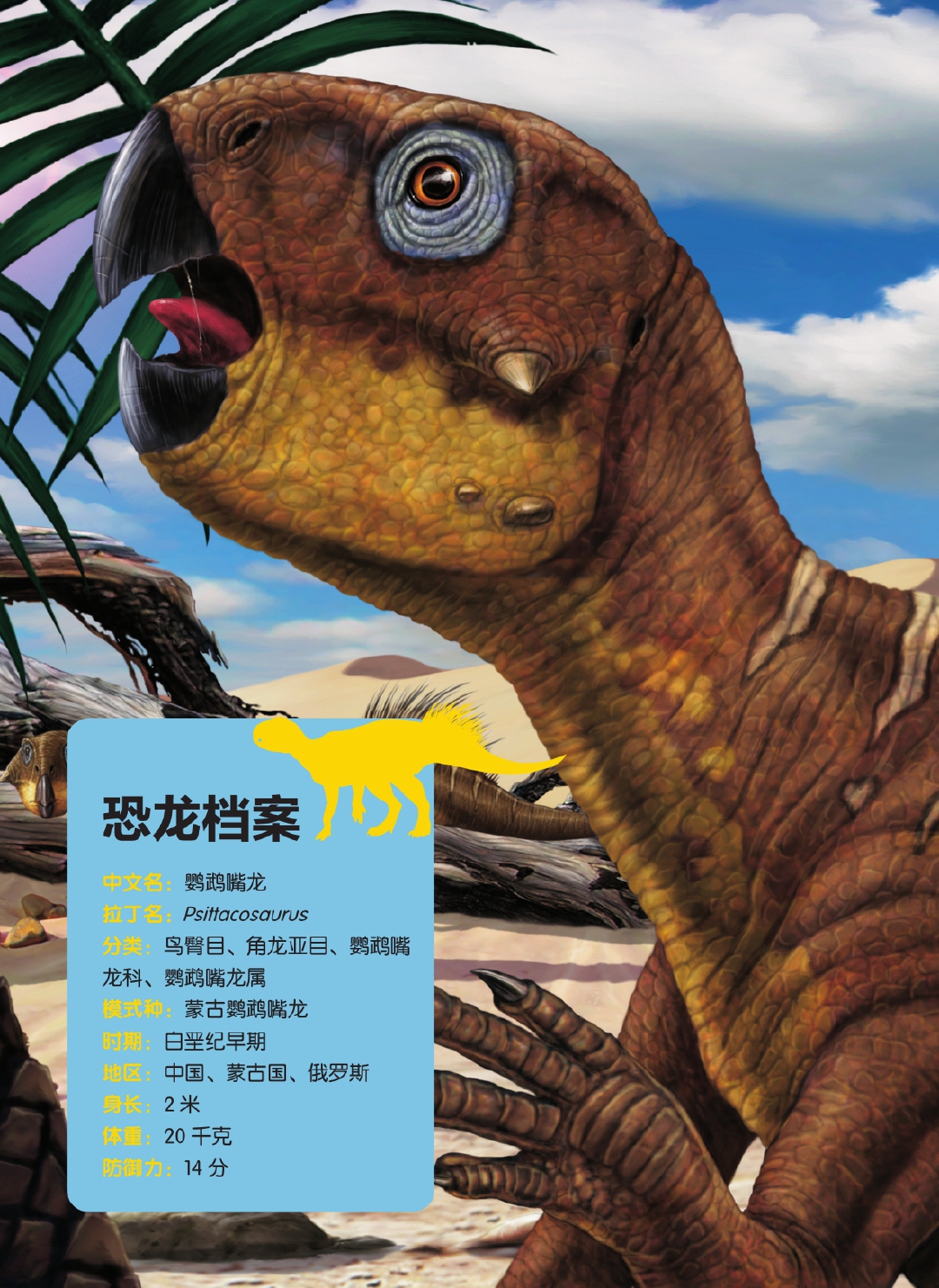 鹦鹉嘴龙是人类最了解的恐龙之一,目前已经发现了400多个包含各年龄层次的标本。它因为长着鹦鹉一样的嘴巴而得名,是一种典型的二足恐龙,但刚孵化出来的幼体却用四足走路,直到三四岁才改用后肢行走。它的尾巴有骨化肌腱,可以像袋鼠的尾巴那样对身体起平衡作用。