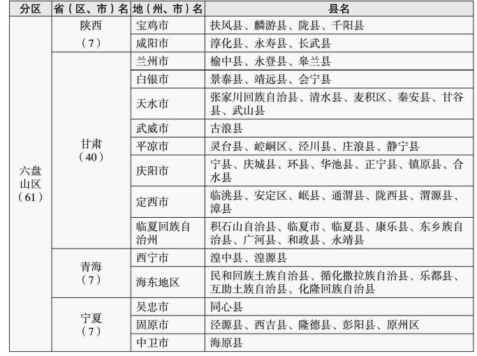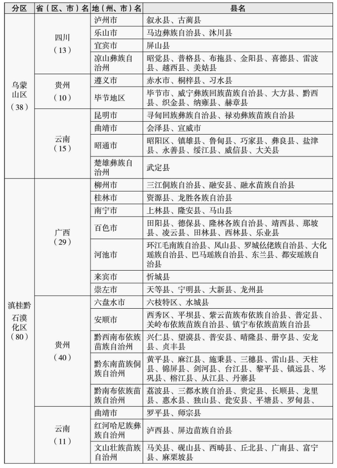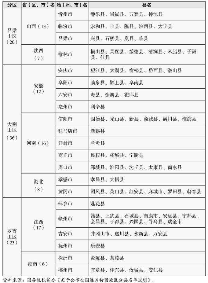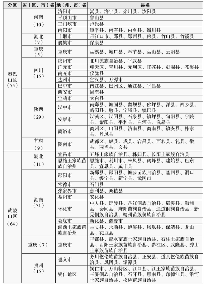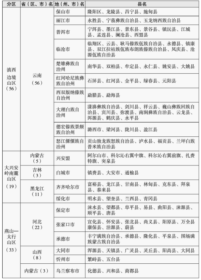 根据《中国农村扶贫开发纲要(2011—2020年)》精神,按照“集中连片、突出重点、全国统筹、区划完整”的原则,根据2007—2009年3月的人均县域国内生产总值、人均县域财政一般预算收入、县域农民人均纯收入3项指标均低于同期西部平均水平的县(市、区)的标准,划定“连片特困地区”,加上国家加大力度扶持的民族地区、革命老区、边疆地区,全国共划分了11个集中连片特殊困难地区,再加上新疆南疆三地州、西藏、四省涉藏工作地区,在全国范围内一共划定了14个连片特困地区。其中六盘山区[包括陕西、甘肃、青海和宁夏4省(区)61县]、秦巴山区[包括湖南、湖北、重庆、四川、陕西和甘肃6省(市)75县]、武陵山区[包括湖南、湖北、重庆和贵州4省(市)64县]、乌蒙山区[包括四川、贵州、云南3省(区)38县]、滇桂黔石漠化区[包括广西、贵州、云南3省(区)80县]、滇西边境山区(包括云南56县)、大兴安岭南麓山区[包括内蒙古、吉林、黑龙江3省(区)19县]、燕山—太行山区[包括河北、陕西、内蒙古3省(区)33县]、吕梁山区(包括陕西、山西2省20县)、大别山区(包括安徽、河南、湖北3省36县)、罗霄山区(包括江西、湖南2省23县)、西藏地区(包括74县)、涉藏工作重点省(青海、甘肃、云南和四川4省77县)以及新疆三地州(包括24县)[4]。