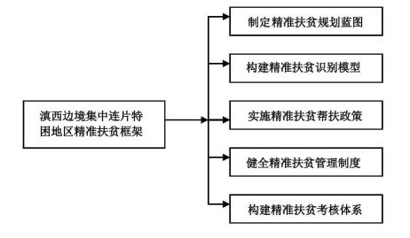 就集“老、少、边、穷”一体的滇西集中连片特困地区而言,为了增强扶贫开发政策的针对性、协同性、可操作性,实现扶贫识别由定性向定量转变,规划由县、乡到村、到户转变,扶贫帮扶由单纯的资金扶持向多维度转变,扶贫管理由静态向动态转变,扶贫考核由单一业绩向综合绩效转变,我们设计了滇西集中连片特困地区精准扶贫战略的思路框架:即勾画一张精准扶贫规划蓝图、构建一份精准扶贫识别名单、完善一揽子精准扶贫帮扶政策、健全一套精准扶贫管理制度、创建一组精准扶贫考核体系。如图1-6所示。