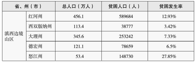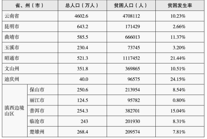 (1)云南省总人口是4602.6万人,其中贫困人口总数是4708112人,贫困发生率是10.23%;滇西边境山区总人口是2230.4万人,其中贫困人口数是2213033人,贫困发生率是9.92%。滇西边境山区贫困人口占云南贫困人口的47%。