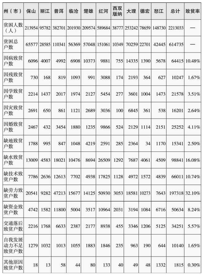 比如,因疾病导致滇西边境山区10个州(市)的贫困户数是64415户,而所列的13项原因导致滇西边境山区10个州(市)的贫困户一共是614735户。那么。因病致贫率=(64415/614735)×100%=10.84%。于是,滇西边境山区因病致贫率是10.84%、因残致贫率是1.67%、因学致贫率是3.51%、因灾害致贫率是2.64%、因婚姻致贫率是4.14%,因缺少土地致贫率是2.50%、因缺水致贫率是16.08%、因缺技术致贫率是10.74%、因缺劳动力致贫率是32.10%、因缺资金致贫率是8.24%、因交通落后致贫率是5.57%、因自我发展能力不足致贫率是1.65%、其他原因致贫率是0.30%。