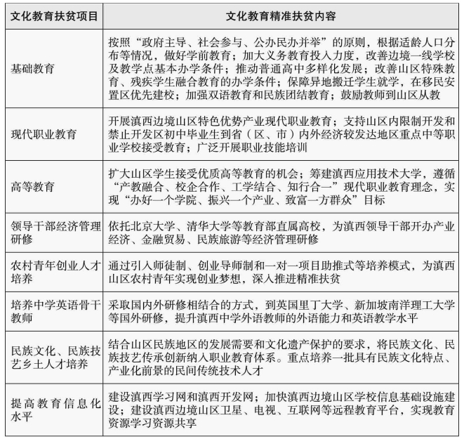 资料来源:根据教育部《深入推进定点联系滇西工作建设人力资源开发扶贫示范区》和教育部、发展改革委、财政部、扶贫办、人力资源社会保障部、公安部、农业农村部《关于实施教育扶贫工程的意见》整理而得。