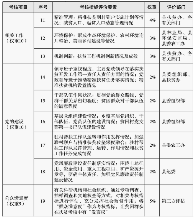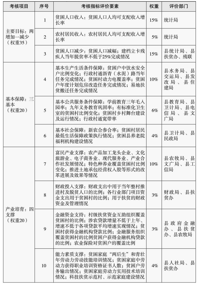 滇西边境山区县级党委、政府按照逐级考核的办法和考核要求,对滇西边境山区贫困乡镇党委、政府的精准扶贫考核,制定了“两增加一减少、三个基本保障、四个支撑、相关工作和党的建设”的评价指标体系。如表6-3所示。