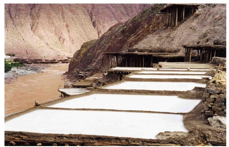 盐井山高谷深,沿江两岸三叠纪红色沙砾层出露有盐泉,据资料介绍,其含盐量高达30.7克/升。当地盐民将泉口扩大,就地势在泉口上层层修建高1.8—2米的方形平顶木棚,顶盖10厘米厚的不透水红黏土层,四周略高,用以晒盐。将盐泉水提至盐田,经3—5天自然蒸发,析出盐分,即为“藏巴盐”。