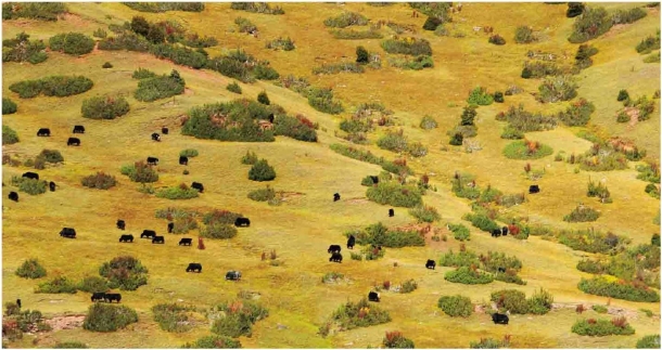 海拔4376米的拉乌山口,一群群牦牛在苍黄的高山上悠然地吃草(2016年摄)