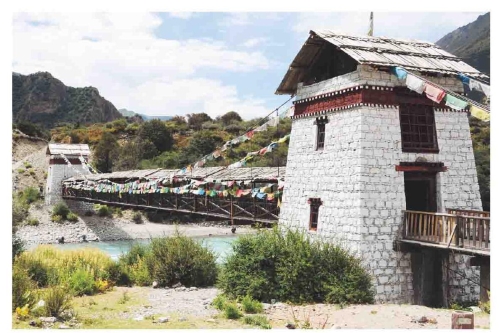 再往前,看到尼洋河上有一座廊桥,路旁竖立一张广告牌,其中提到如下四古景点:太昭古城、唐蕃古道、茶马古驿站、清朝古墓群。行程匆忙,无暇去看。