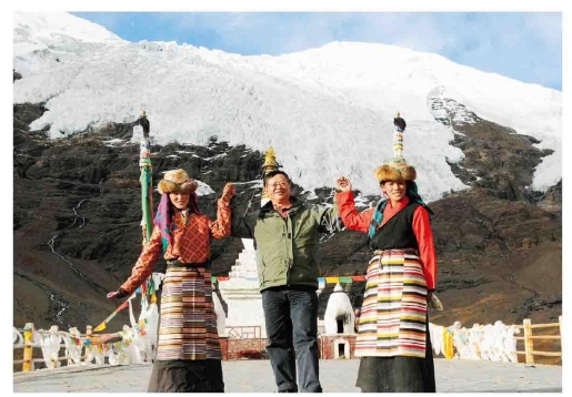 与两个美丽的藏族姑娘在冰川下合影留念(2016年摄)