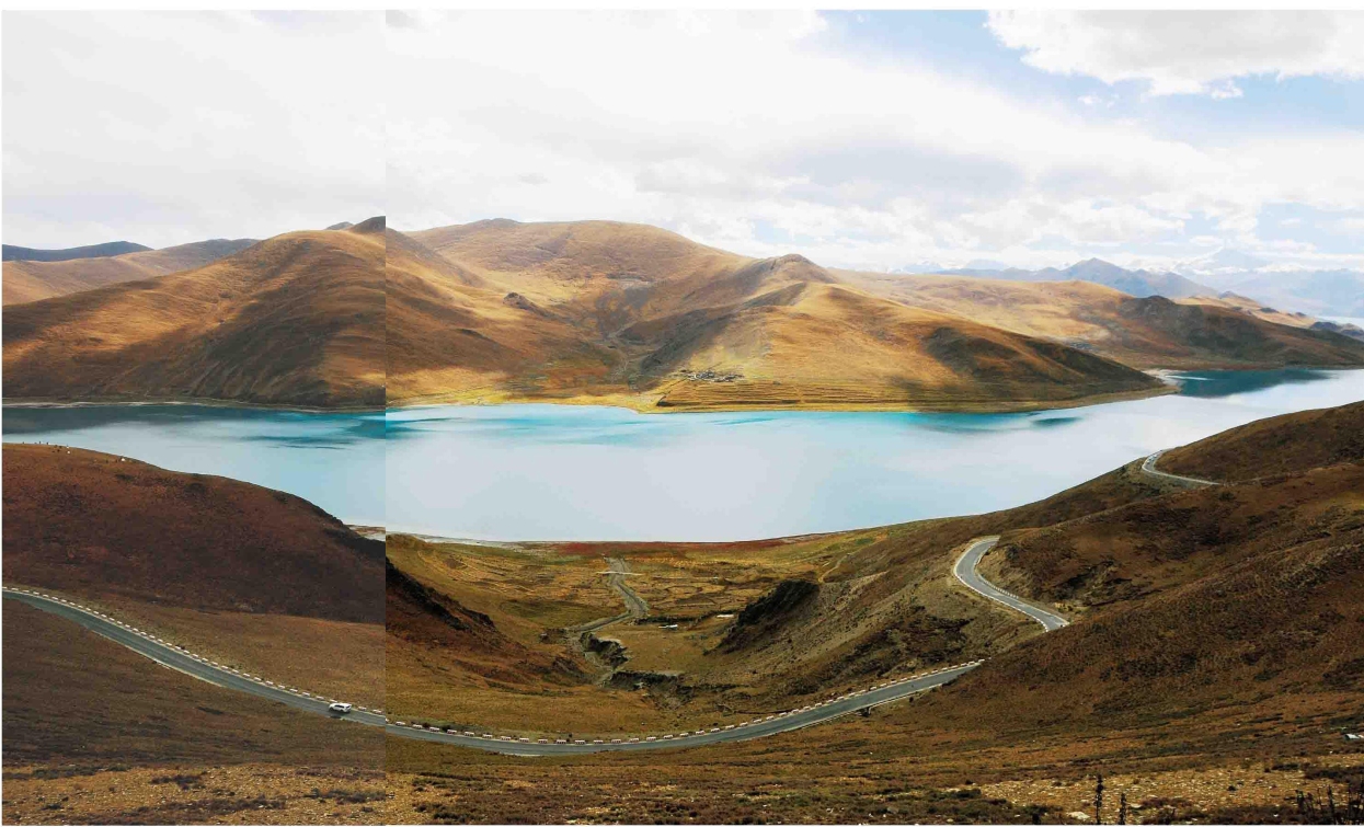 10月16日,我们从雍布拉康出来后继续赶路,路过贡嘎县。贡嘎县是西藏自治区山南市下属的一个县,位于西藏自治区南部,雅鲁藏布江中游河谷地带。我们翻越寒凉而有很多苍黄色草甸的山,一路欣赏苍苍茫茫的壮阔山川,终于来到了慕名已久的羊卓雍错。羊卓雍错简称“羊湖”,藏语意为碧玉湖。羊湖位于西藏自治区山南市的浪卡子县,在拉萨西南约70千米处,与纳木错、玛旁雍错并称为西藏三大圣湖,是喜马拉雅山北麓最大的内陆湖泊。羊卓雍错的面积有675平方千米,湖面海拔4441米。从拉萨到羊湖需要翻越5030米的岗巴拉山口。我们是从山南的江孜出发去羊卓雍错的,翻越过一个个积雪的山峦,一路看到很多在苍黄的草甸上徜徉的牦牛,翻过一个经幡飞舞的山口,眼前倏然出现了一个大湖,宛如一颗巨大的蓝宝石铺在天地之间。西藏的神奇就是在不经意间,一个天地的大美就突然呈现在眼前,使你惊叹大自然的壮丽神奇。眼前的羊卓雍错也是给我这样的感觉,这种美的冲击力如此之大,使我禁不住要大声地呼喊出来。