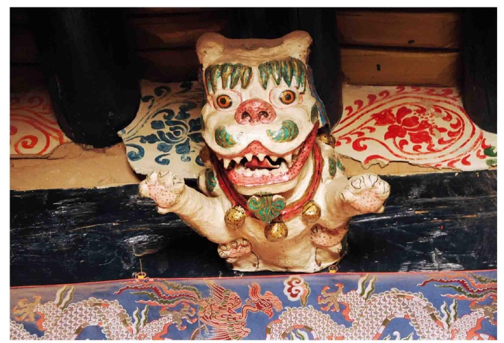 我在楚布寺寻找十世噶玛巴却英多吉的画像,但没有找到,当代十七世噶玛巴的画像倒是各个殿里都能看到。楚布寺里有个殿有很多精美的壁画,殿前柱子上方还挂着不少牦牛、黄牛、盘羊、绵羊等动物的头,显然可见本教和佛教融合后的信仰古风。