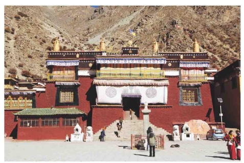 楚布寺一进去就是三座大殿,中间和左边的两座是褚红色的,只有右边那座庙宇是土黄色的。庙宇背后是一座不长树木、岩石裸露的山岗。楚布寺背后名为加日吐切琼博的山腰处,有一座白色建筑物——卓康,即是该寺僧人修炼之处。按照噶举派的修行方式,一般修炼时间为三年三月三天三时。修炼期间不准外出,也不能与外界任何人接触,他们的食品有专人从一个窗洞中传递进去。丽江噶举派名寺文峰寺也有这样的静坐堂。我参访过文峰寺的老僧孙诺(已于2000年病逝),他来过楚布寺,他为我讲述过这个修行的详细过程。据楚布寺里的介绍文字,1959年之前,该寺已经有上万僧众在这里闻思修行,1966年后遭到严重破坏,1981年之后陆续重新修缮。正中大殿正门上方挂着落款国务院宗教事务局1992年立的匾,上书“庄严国土”4个大字。
