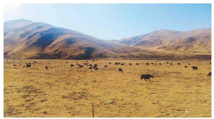 苍黄的草地上,牦牛与马在一起友好地吃草(2016年)