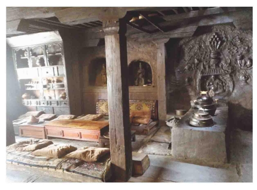 这个村是纳西族与藏族通婚而形成的一个村子。丹增的家有个很大的老宅,据家里人的回忆,这个老宅至少也有300多年了。老宅古色古香,柱、梁、门、窗雕刻精工,木头发出黝黑的亮光,呈现着一种岁月的沧桑,一看就是年深月久的老宅了。丹增告诉我说,他父亲都说不清楚这个房子已经有多少年了。根据他们家人的回忆,这房子至少已经有300多年了。在厨房兼家人吃饭的那个大房子里,最有特色的是火塘灶,火塘灶现在已经不是用铁三脚支锅的灶了,而是整体用铁铸的。灶台靠里的一面整个是一堵熏得黑亮黑亮的泥雕,上面雕着火神,与云南纳人(摩梭人)火塘灶上所供奉的火神詹巴拉形象很相似,貌似一团火焰。两旁各塑一只猫和一些佛教吉祥符号,下面正中间塑一个象征吉祥福气的弥勒佛,上面还塑着净水瓶、如意结等吉祥物。乡城的民俗文化中,特别尊崇猫,严禁伤害猫,即使是野猫,也禁忌捕猎。家家户户在灶台神龛上塑猫,绝不可少。这使我想起纳西族也尊崇猫和狗,民间和东巴经典中都有猫和狗从天神那里给人类带来了五谷种子的传说,所以过大年三十时,首先要把第一块腌制猪头肉喂狗和猫。乡城藏族的猫崇拜,和同为藏缅语族的纳西对猫的尊崇或许有同样的文化渊源。