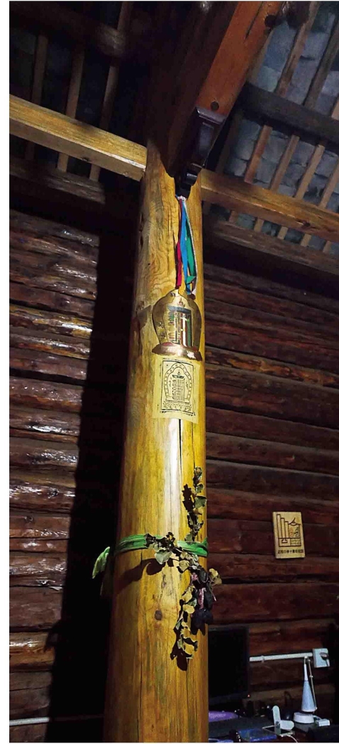 我注意到柱子上插着各种象征五谷神、畜神、素神(生命神或精灵)等东巴教神祇的木牌和木桩,火塘文化的基本元素与丽江等地的纳人相同。但达祖村在神龛上还挂着藏传佛教的神祇、八宝等唐卡卷轴画。神像边框用哈达等围饰着,正房(母房)的木门上方挂着传统的吉祥纸马或经幡,家里的院子屋檐下也挂着各种藏传佛教的经幡。