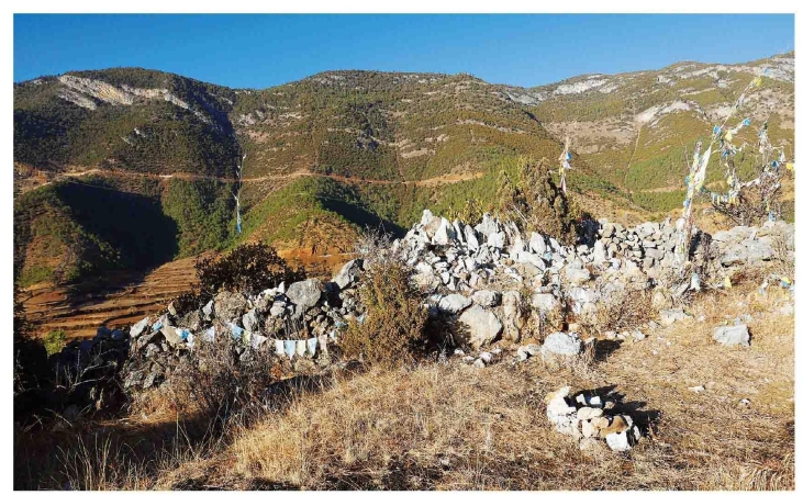 达祖村的传统祭天坛在村子南面的一座山上,山头用很多石头围砌成环状,上面挂着一些风马旗,祭天坛旁边有个用石头围起来的地方,当地人称为“磋短”(cod duer),是放祭品和祭天前夕守夜的人栖息之处。