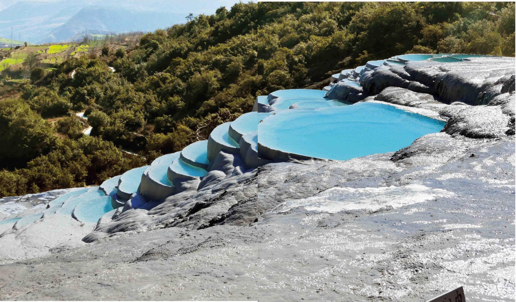 1989年初春,我独行于泉华平台上,周遭山林寂寂,万籁无声。洁白如乳的一层层平台上水清如镜,倒映着高原那湛蓝得使人心醉的天,这映着蓝天的台地看去又极像一大片清莹莹的绿玉。白云在梦幻般的水中流连徘徊,微风吹来,泛起层层涟漪。我在静谧中独自体验着这圣境的安详,在内心中怅然自问:当年在此弘扬教义的东巴教祖师东巴什罗和阿明什罗而今安在?