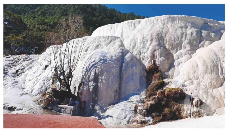 从1989年起,我多次到中甸县(今香格里拉市)进行人类学田野调查,1989年初春第一次来到白水台。它位于中甸县东南部,从县城里坐车约行101千米便到达这个圣地。从崎岖的盘山公路上转过最后一道弯,最为醒目的首先是远远一片镶嵌在苍翠林屏中的白色,它宛如很多东巴经开篇中所提到的那混沌初开时的一团白光。随着车子越开越近,这白光越来越亮,最后这天造地设的白水台泉华奇观就整个地来到你的眼前。