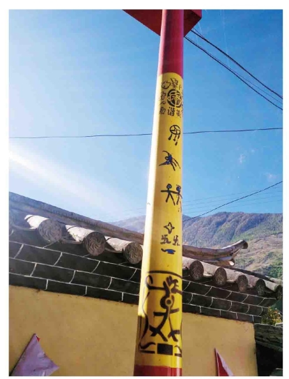 叶枝镇的路灯杆上写上了纳西东巴象形文字(2017年摄)