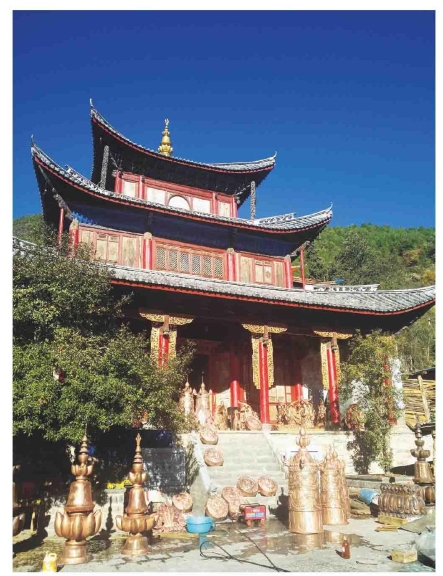寿国寺是叶枝康普一带很有名的藏传佛教寺庙,我们慕名前往。该寺位于康普乡戛拉石上村,始建于清雍正十二年(1734),历时5年建成,清乾隆十年(1745)因失火被焚毁,后于乾隆三十五年(1770)迁至现址重建,清同治六年(1867)重修。寿国寺的建造,据说是康普土千总禾娘积极捐资而成,后来就成为滇西北藏传佛教噶举派十三大寺院之一。史书记载,康普土千总禾娘就将大量的田产捐给寿国、兰经两座寺,单是寿国寺就拥有过12个田庄。另一部分是一些僧人在出家时由家中分出一份田产带到寺庙里,通常称为僧人的“私房田”,一般供其生活开支,本人死后即归寺庙公有。