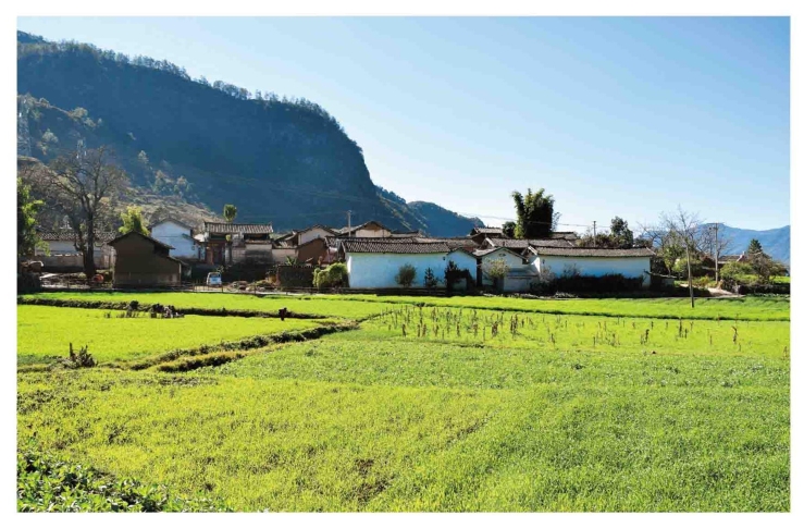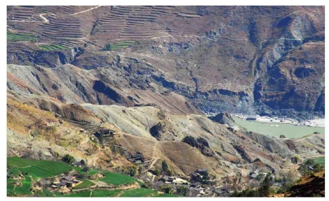 拉伯乡政府所在地的拖甸村一瞥,中间那座山叫掉锅山(2015年摄)
