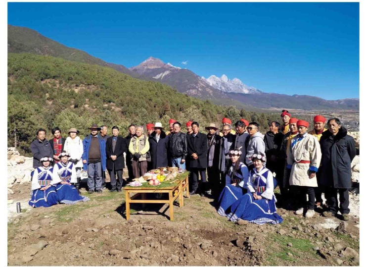 选好的祭祖祠奠基地真是个好地方,是在玉龙雪山西麓下的一块土地,山上林木苍青,玉龙雪山在蓝天下闪烁着吉祥柔和的光。上午11时,奠基仪式举行,东巴咏诵《除秽经》《土昌肯经文》《烧天香经》《五行来历及点药经》《祈福经》等,按东方木、南方火、西方铁、北方水、中央土的顺序放进“五行”坑里的陶罐中,给“五行之物”及祖祠奠基地的地基点药奇祈吉,祖祠建设筹备组的工作人员为“五行之物”盖上“五行”十二生肖巴格图石板,参会人员将土盖在石板上。
