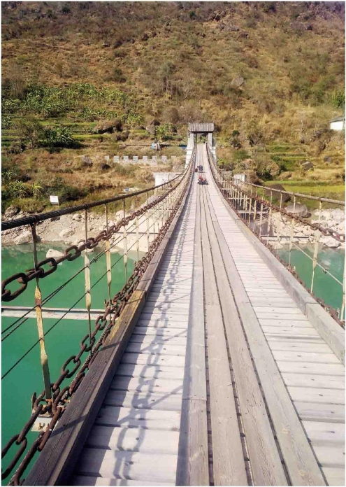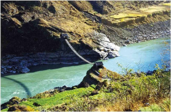2000年,我第一次去铁索桥,先在金沙江畔树底老铜矿一个纳西大妈开的颇有名气的火腿饭店吃饭,然后步行去看梓里铁索桥。那时没有公路,我们沿着金沙江崎岖的小路前行,路不好走,有些路段还有山上的泉水流淌下来,滑溜溜的,我们小心翼翼地前行。初冬的金沙江蓝莹莹的,蓝天上飘着朵朵悠闲的白云,与江水相辉映,看去赏心悦目。金沙江在山谷里发出浩荡沉宏的流水声。我们终于来到了这座闻名遐迩的铁索桥边。