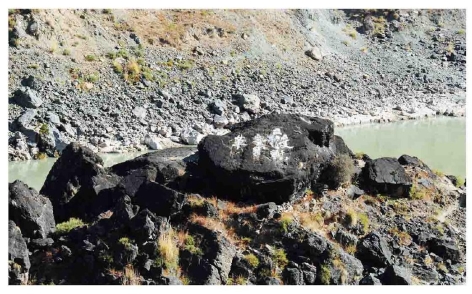 20世纪20至40年代,美国的传奇探险家、纳西学家洛克多次从奉科渡口渡江去宁蒗县永宁,他在《中国西南古纳西王国》一书中,详细描写了他从奉科渡口过江去永宁的情景,并拍摄了不少照片。我们这次来到这个渡口,恰恰就是当年洛克渡江之处,与我同行的好朋友夫巴带来了几张洛克在此渡江时所拍摄的照片,我们还看到了洛克所描述的在江水暴涨的季节,常常被水淹没的“巨大的长方形岩石”。我们考察时正是冬季枯水时节,江畔那黑色的大岩石矗立着,奉科乡文化站在石上写上了“革囊渡”几个大字,远远就可以看到。据介绍,现在江水在雨季也不会淹没这个巨大的岩石。而我们在与这个岩石高度差不多的地方,是踩着熠熠生光的沙子地而行,显然,这些沙地是从前江水漫上来而逐渐形成的。