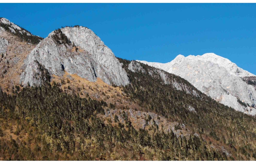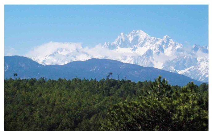 越往奉科方向走,玉龙雪山就越发显出它那不积雪、少森林的石灰石巉岩的地貌。沿途一路可看到很多的云杉、冷杉和栎树,在海拔高的地方,树木长得都不高大,而在地势稍低的地方,云杉、冷杉和栎树都高大挺拔,直插蓝天。当地人说的“树胡子”缠绕在云杉和冷杉树上,十分好看。沿途玉龙雪山山坡上长有大片纳西人祭天必须用的栎树,叶子黄生生的,与山峰、蓝天和白雪交相辉映。我们在途中还看到了位于四川亚丁的“三大神山”的两座:央迈勇(海拔5958米)和仙乃日(海拔6032米)。