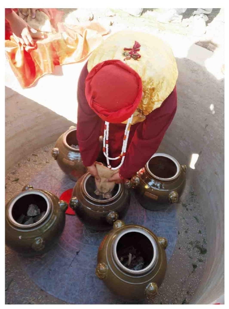 东巴把取自滇川藏青各地的木、火、土、铁、水“五行之物”——放进陶罐里(2018年摄)