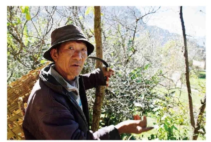 杨学红东巴是老东巴和学文的学生,在20年前在汝南化什罗灵洞举行了“加威灵”仪式,他是此行去该灵洞的带路人。我们爬了不少山路,由于这几年森林植被好了,密密匝匝的树林遮住了视线,杨学红东巴也一时迷了路,找不到去往灵洞的路了,我们在林子里转了半天。后来出来请教了汝南化村一个在地里干活的村民,在他的带路下我们才寻找到了灵洞。