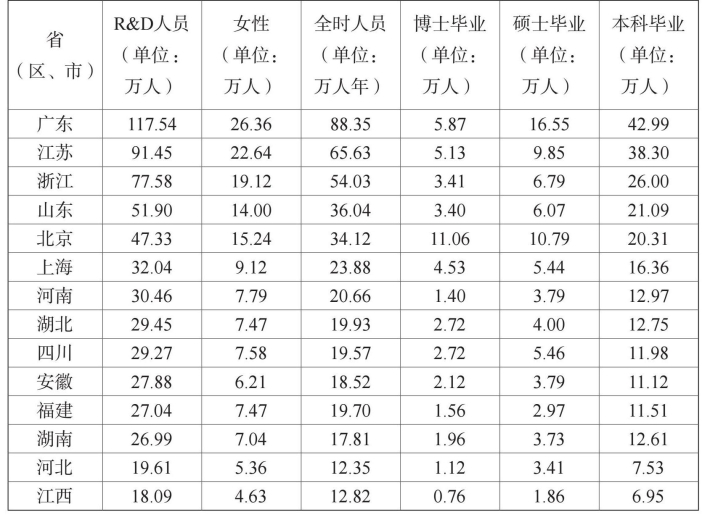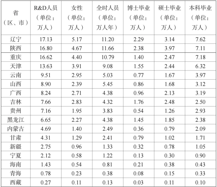 2020年,云南省R&D人员有9.51万人,R&D人员(折合全时当量)有5.03万人年,分别在全国31个省(区、市)排名第19位和第20位。12个西部省(区、市)R&D人员和R&D人员(折合全时当量)最多的省份为四川省,分别为29.27万人和19.57万人年,云南省在R&D和R&D人员(折合全时当量)和其他西部省(区、市)相比处于中游水平,仅次于四川、陕西、重庆,超过了广西、贵州等省(区)。与四川、陕西和重庆差距较大的主要原因是:我省具备研发与试验发展能力的高校和院所数量差距较大,同时我省规模以上工业企业中拥有专职研发机构的数量较少,再加之部分大中型龙头企业和上市企业由于市场需要,研发中心外移,多重因素导致我省R&D人员规模相对较小。