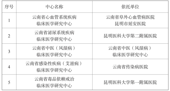 为加强云南省临床医学科研水平,推动云南省临床医学科技创新体系建设,推进和加快临床医学研究中心建设,加快打造云南健康生活目的地,结合云南重点疾病领域和特色学科建设,省科技厅和省卫健委、省药监局启动了云南省临床医学中心相关工作,并邀请了全国知名院士及专家为云南省临床医学中心的建设布局、规划运行、管理服务提供咨询,经过前期的申报、审查、评审、现场考察等阶段,认定了第二批5个云南省临床医学研究中心(见下表)。通过云南省临床医学研究中心建设,为建设国家临床医学研究中心、国家临床医学研究中心分中心、针对区域特有重大疾病建设省部共建中心等奠定坚实基础;有助于贯彻落实云南省创新驱动发展战略,充分发挥科技创新在改善民生和社会发展中的支撑和引领作用,将为云南省形成一批医学诊疗、科学研究与人才培养等全方位发展的临床医学优势学科,加快医疗新技术的研究开发,加快优质高效的医疗卫生服务体系的构建,带动全省科研能力、诊疗水平、学科队伍的全面提升。随着科技创新政策和机制的完善,经费投入的加大,一大批先进医疗技术开始给普通群众带来了实实在在的好处,科技创新切实成为医疗健康发展的催化剂。
