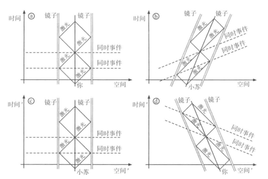 你可能会说小苏搞错了,但是在她看来搞错的人是你,因为对她来说,你才是那个处于运动中的人。在她看来,其实是你的激光脉冲没有同时击中那两面镜子(参见图2c和图2d)。