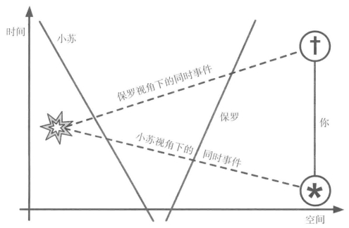 再进一步假设,当你死的时候,超新星发出的光还没有到达地球。而你的另一位朋友保罗找到了某种办法在你和超新星之间穿行,这样他就能同时看到你的死亡和超新星爆发。从保罗的视角来看,这两件事同时发生了。在宇宙飞船上坚守岗位的两位朋友,虽然你们并不存在,但是这就是你们看到的情况!