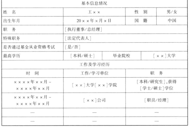 ①从业人员的履历表:该表格主要反映基金管理人的从业人员的个人履历和职业经历,一般从大学教育经历填写至最近的职业信息,如表20-1所示。