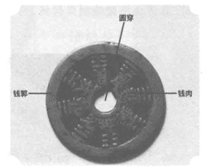 按钱币学术语讲,钱币上的孔叫“穿”,方的叫“方穿”,圆的叫“圆穿”。而穿周围的钱体称为“钱肉”,钱体内缘或外缘有一圈凸起的边棱,称为“钱郭”。