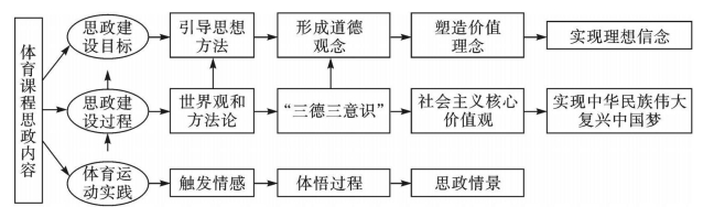 各门课要把做人做事的基本道理、社会主义核心价值观的要求、实现中华民族伟大复兴的理想和责任融入教学之中,使各类课程与思想政治理论课同向同行,形成协同效应。体育课程思政要以立德树人为目标,通过运动实践积极培育学生的社会主义核心价值观,合理运用马克思主义方法论,塑造学生做人做事的人生观和价值观。