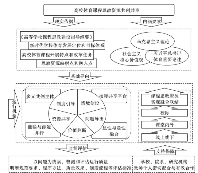 高校体育课程思政资源共创共享模式的运行机制是各要素相互作用、有序运行的内在机理,是调动体育课程思政资源共创主体、打通校际资源共享路径、丰富体育课程思政资源类型的关键一环。高校体育课程思政资源共创共享模式的运行,重点突出“如何共创”和“如何共享”。通过学校、院系、研究机构、教师的协同参与,实现思政资源共创主体的多元化;通过构建校际体育课程思政资源交流平台,畅通体育课程思政资源共享路径,坚持灌输与渗透并行的原则,促使体育课程思政建设实现显性资源创设与隐性资源感悟的有机融合,推动高校体育课程思政资源共创共享模式的构建。