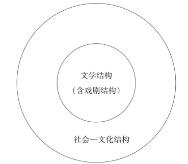 由此可知,包括戏剧结构在内的文学结构完全可以以一个子结构的身份“加盟”到更广泛的社会—文化结构中去(如下图所示),二者之间似乎构成了“同心圆”的关系。前者构成同心圆的小圆,后者构成同心圆的大圆。前者虽“加盟”于后者,但二者之间边界清楚,后者并未因此而“吞并”或消融前者。文学结构既成为社会—文化结构中的子结构,那就应该对这类结构中各成分之间的关系进行研究。从某种意义上说,这种研究也是结构主义的。