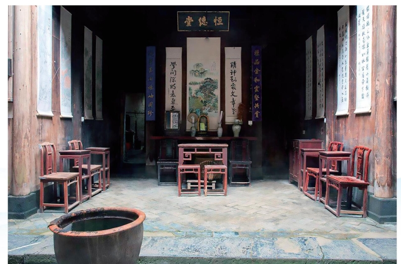 中堂,是生活空间和精神空间,教人仁义孝悌。说起中堂,农村人一定不会陌生,家家户户都有个中堂,俗称“堂屋”,设在房子最中间。正壁会有“香火”,上书“天地君亲师”等燃香供奉,也就是教人敬天、敬地、爱国、敬亲、尊师。在堂前你要谨言慎行,出堂外也要心存敬畏不能张狂,“头顶三尺有神明”,就是中堂文化向堂外的延伸,你的言行必须为自家祖辈负责。也有的中堂悬挂“福、寿、龙、虎”等寓意吉祥的大字,或者悬挂祖训、格言、名句书法题字等。现代城市居民多称中堂为会客厅。