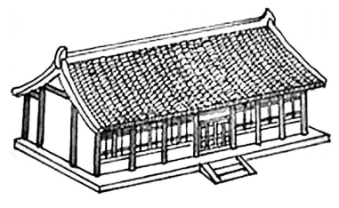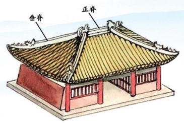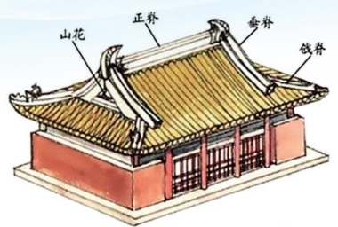 硬山顶 有一条正脊和四条垂脊。这种屋顶造型的最大特点是比较简单、朴素,只有前后两面坡,而且屋顶在山墙墙头处与山墙齐平,没有伸出部分,山面裸露没有变化。
