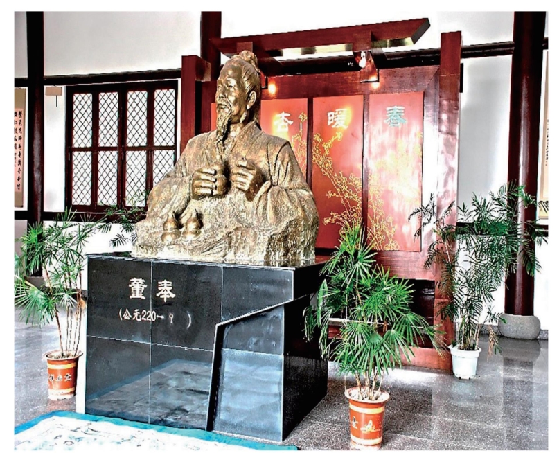 董奉少年学医,信奉道教。年轻时曾任侯官小吏,不久归隐,有慧根。在其家后山中,一面练功,一面行医。他医术高明,治病不取钱物,只要重病愈者在山中栽杏五株,轻病愈者栽杏一株,数年之后有杏万株,蔚然成林,郁郁葱葱。春天杏子熟时,便于树下建一草仓储杏,有需杏的人可用谷子自行交换。而他再将所得之谷赈济贫民,供给行旅,“杏林春暖”一词便由此而来。