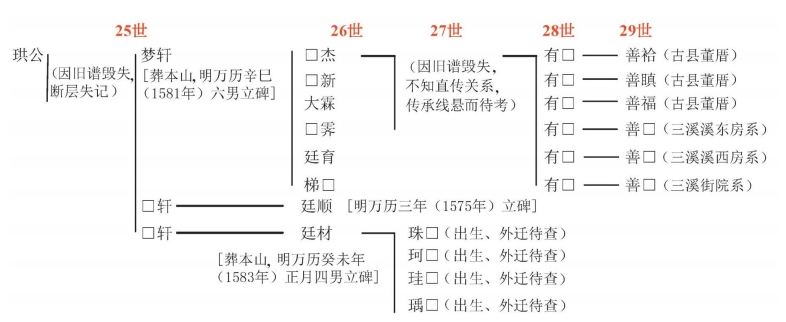 唐上元元年(760年),防御使董玠因其地卑湿,将县治移至吴航头。沧海桑田,今非昔比,千年历史积淀,世代繁衍,古槐董氏族史必然非同一般。古槐董氏为新宁古县最早的姓氏,现董厝村紧靠新考证发现的新宁县衙故址——元明西境。另外,长期流传于当地的古地名“上董境”“下董境”“福船洋”分布在龙田大部分地区。二十年前,古槐群众重修石碧山寺庙时发掘出一块镌刻有“董玠”名字的残碑,后不知去处,可佐证当时董氏族群分布于古槐大部分地区。此外,据古槐董氏另一分支三溪董氏的记载:“三溪乡谚曰‘先有廖董,后有陈潘’。”三溪潘氏为今日名门望族,亦始迁于唐末,其也认定董姓先于潘姓,三溪有座古桥,原称廖厝桥或董厝桥,未改成潘厝桥,直至清代一次重修,仍尊董姓者担当缘首。董姓留名古碑,担当缘首者多处可见。可见,当时董家人丁兴旺,住地覆盖古槐及南部地域,确为“千年老董”。