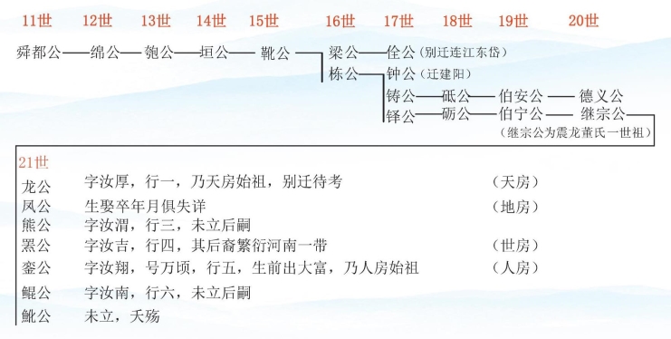 董玠九世董璘公生二子,长曰思诚,次曰思谨,思诚公于宋端拱二年(989年)由福唐城迁长乐之黄岐沙里,思诚孙舜都公卜迁二十四都艾石山下震龙境(今后董村),今传24世,居村500余户1100多人。