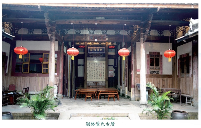 在潮格村,董氏祖屋数量最多。相传清乾隆年间,董氏12位兄弟就建了13座祖屋,每座长方形布局,结构与风格大致相同,土木建筑,火墙包栋。其中,潮格村65号祖屋为清代早期建筑,保存也较为完整,依次由前廊房、左右厢房、天井、主座组成。穿斗式木构架,悬山顶。建筑内木雕精美,前山墙为一字形,左右两侧山墙为马鞍形,围墙由长方形青砖砌成。这几年,潮格村采用“三策”使古厝重焕生机:一策是修缮保护使古厝添生气;二策是变身“书院”“国学馆”增人气;三策是引资开放民宿积财气。