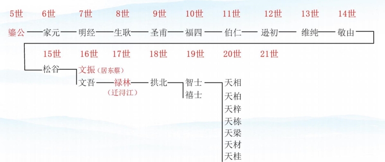 先祖董兴公在宋庆历时因战功显赫,特进银青禄大夫上柱国太尉,分镇于闽,立籍泉州登贤里。二世董道公,封平凉郡开国伯。三世董宗嗣封平凉郡开国伯。四世董堰公为大观进士,封工部尚书、随州刺史。董偃公生五世董鎏公,宋朝进士,敕封英济侯,后因战乱归隐兴化莆田五侯山,后开族启乡东蔡(石狮沙堤与前沁村董氏族谱记载相同);明弘治三年(1490年),六世董家元官居府学岁贡;清朝年间,七世董愈为进士,八世董□郡庠;九世董圣甫为浙江嘉兴府桐乡县参军;十世董福四、十一世董伯仁为江西吉安府通判(在石狮沙堤与前沁村董氏族谱均有相应记载)。十五世祖松谷公生二男,长文振,次文吾,后起人物本宗祠族谱只作简记,其中十六世董文振长居东蔡开族,因族谱不慎失火烧毁,后人尚未续谱;董文吾初居东蔡村,后同其子禄林公迁浔江村(现东峤镇前沁村)。