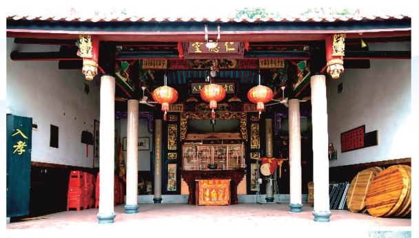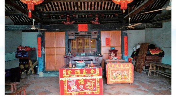 大门之后为天井,天井两侧围墙与大厅连接围成庭院,其中两个仪门在大厅两侧。地面由前而后逐级升高,红色地砖似红毡般一路铺进。天井及其四周阶石以细凿白石铺砌。三对六根磨光白色石柱支撑大厅,享堂大厅明间不设门扇,为敞口厅,是家族祭祀、聚会议事之所。在大厅后石柱间设有橱柜式铝合金玻璃制作的供奉祖先的精美神龛,神龛之上悬挂红底金字额匾“银青柱国一品夫人”。曾有台湾地区漳化二水董氏宗亲前来祭拜。