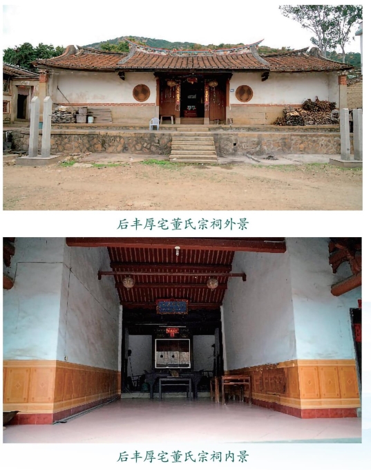 后丰厚宅董氏宗祠位于沙坛村狮山下后丰自然村中,祠堂占地面积300平方米,建筑面积150平方米。坐南朝北,土木上下房二进结构。祠堂前是大面积广场,两侧立有两对旗杆石。从广场上7级石阶进宗祠木大门,大门的上方悬挂着蓝底金字匾额,上书“董氏宗祠”。宽大的白色裙墙镶有一对透镂方格圆窗,显得简朴大方。祠堂瓦作是用筒形红瓦。宗祠主体由上房、下房及厢房组成,上房面阔五开间(六榀五植),正中为享堂大厅,左右两边各有两间厢房,下栋左右为厢房,中置天井,系木结构建筑,有围墙及门庑等连接围成家族庭院。祠堂中轴线由大门、下房屏风、天井、厅堂、神龛构成。天井三级石阶上厅堂,由前而后逐级升高。享堂大厅为木质敞口厅,同样铺红色地砖,古朴典雅。家族每逢春节、清明、七月十五日、冬至举行祭祀、聚会。大厅后设有橱柜式木作的供奉祖先的神龛,神龛之上悬挂蓝底金字额匾“宋银青 上柱国 光禄大夫 一品夫人”。