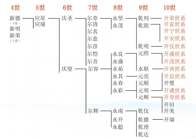 樟湖董氏自高祖董琼公起五代取行派和字,为“永、元、开、隆、运、兆、世、发、光、昌、尔、文、行、忠、信、祥、钟、乍、乃、长”。