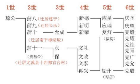 董琼在朝为代理宰相,全家数十余口世居浙江省金华府金华县。明朝成化元年(1465年)遭朝中奸臣冒奏陷害遇故,全家出避,各奔而去。唯董母钱氏福娘同子五人遁入江右广信府贵溪县(今江西省贵溪市)离城六十里乌鸽桥孔家庄驻足,并置租业甚多,安居数载。此际母恐前事发,由蒲一公同母独居原址,其余兄弟四人迁至福建福州府长乐县后,蒲八公迁居建宁府,蒲九公仍在长乐县居住,蒲十公迁延平府南平县垂裕乡(今南平市延平区樟湖镇),蒲十一公迁居尤溪县十四都官台村(今尤溪县西滨镇三连村)。